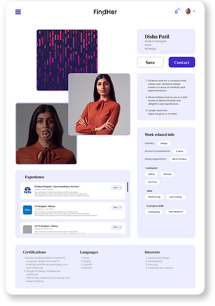 FindHer is a job search web app that empowers women in India to search for employment and enter the workforce. The web app is unique for its dating app-like matching, where both job applicants and businesses can be users and determine top matches with the other sides’ profiles.